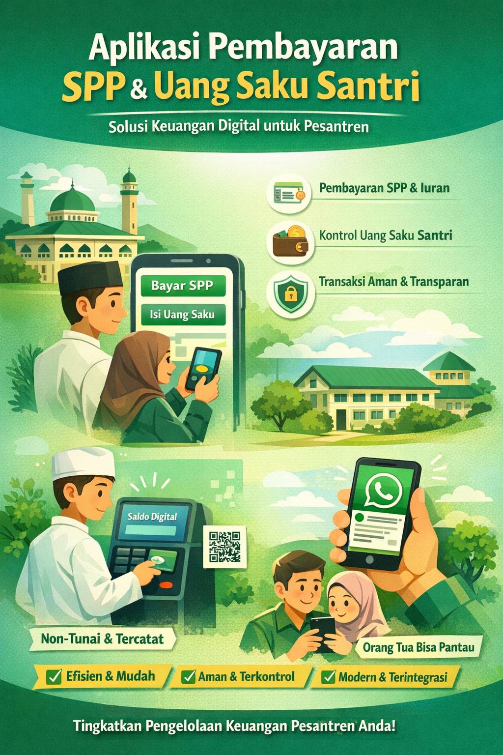 Pengelolaan pembayaran SPP, iuran administrasi, hingga uang saku santri yang masih dilakukan secara konvensional terbukti menimbulkan berbagai persoalan, mulai dari pencatatan yang tidak rapi, keterlambatan pembayaran, hingga risiko kehilangan uang. Dalam konteks inilah, transformasi digital bukan lagi sekadar wacana, melainkan kebutuhan strategis. Aplikasi Pembayaran SPP dan Uang Saku Santri Pesantren hadir sebagai solusi modern untuk menjawab tantangan tersebut secara menyeluruh.